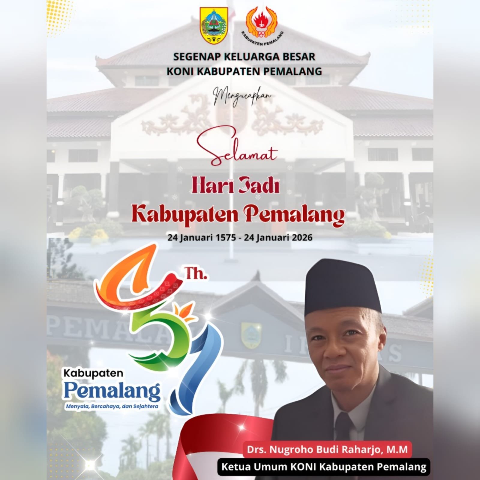 WARTA NASIONAL – Ketua Umum Komite Olahraga Nasional Indonesia (KONI) Kabupaten Pemalang, Drs Nugroho Budi Raharjo, MM menyampaikan ucapan selamat memperingati Hari Jadi ke-451 Kabupaten Pemalang.