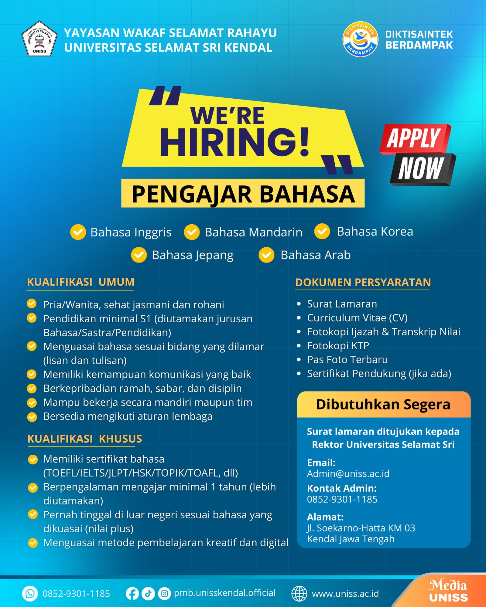 Dalam pengumuman resminya, kampus yang dikenal dengan sebutan UNISS tersebut membuka kesempatan bagi pelamar untuk mengisi posisi pengajar Bahasa Inggris, Mandarin, Korea, Jepang, dan Arab.