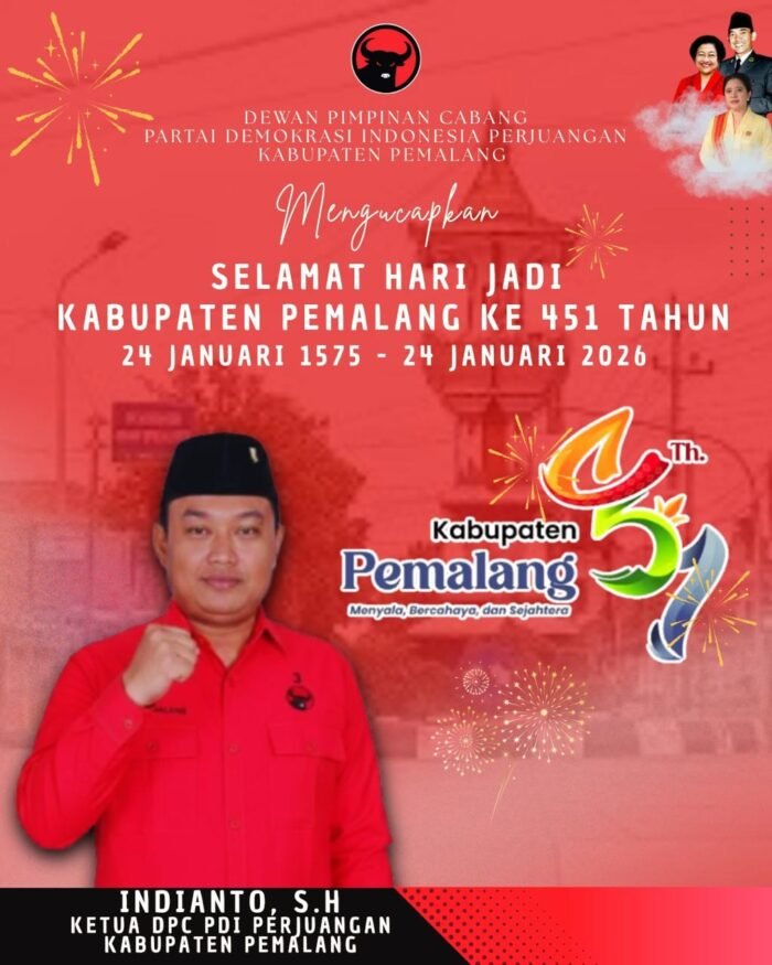 WARTA NASIONAL – Dewan Pimpinan Cabang (DPC) PDI Perjuangan Kabupaten Pemalang menyampaikan ucapan Selamat Hari Jadi ke-451 Kabupaten Pemalang yang diperingati tahun ini dengan mengusung tema “Menyala, Bercahaya, dan Sejahtera.”