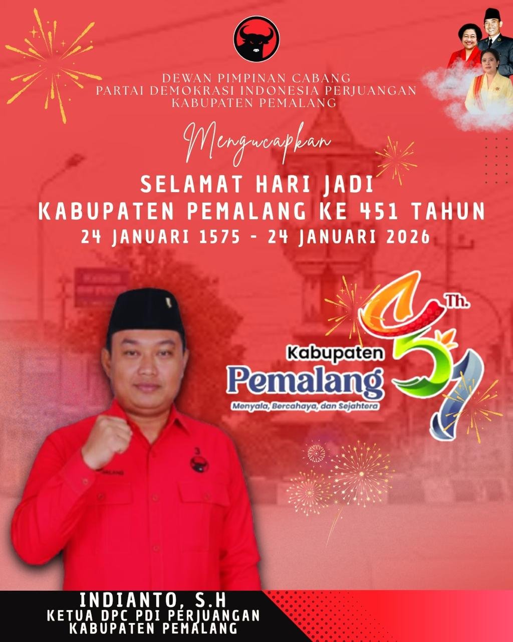 Ketua DPC PDI Perjuangan Kabupaten Pemalang, Indianto, SH beserta seluruh jajaran pengurus menyampaikan harapan agar Kabupaten Pemalang terus mengalami kemajuan di berbagai sektor pembangunan serta mampu meningkatkan kesejahteraan masyarakat secara berkelanjutan.