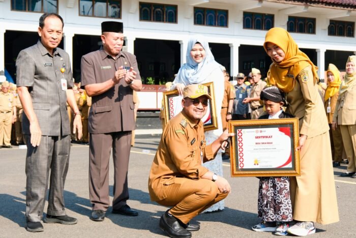 WARTA NASIONAL – Bupati Pemalang Anom Widiyantoro menyerahkan beberapa penghargaan tingkat nasional pada kegiatan Pekan Merah Putih Taman Asuh Sayang Anak (Tamasya) dari Sabang sampai Merauke Tahun 2025 yang diselenggarakan oleh Kemendukbangga/ BKKBN Pusat saat memimpin Apel di sebelah timur Pendopo Kabupaten, Senin (6/10/2025).