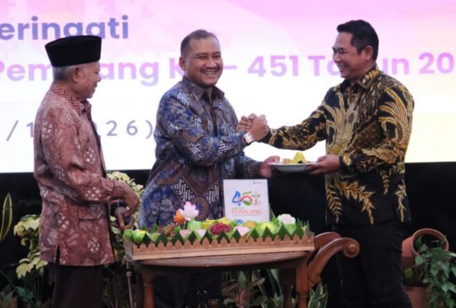 WARTA NASIONAL – Bupati Pemalang Anom Widiyantoro didampingi Wakil Bupati Pemalang Nurkholes bersama istri menghadiri acara wungon dalam rangka Peringatan Hari Jadi ke-451 Kabupaten Pemalang di Pendopo Kabupaten Pemalang, Jumat (23/1/2026).